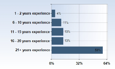 Based on the 58 active job seekers searching for the Industrial Production Manager position, the following graph shows us that the highest percentage of job seekers with 21+ years experience is 59% and the lowest is 1-2 years experience at 4%: