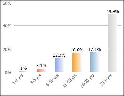 Based on the 1,683 active job seekers searching for the Plant Manager position, the following graph for experience level shows us that the highest percentage of job seekers are those with 21+ years of experience at 49.9% and the lowest percentage of experience is 1–2 years at 1%.